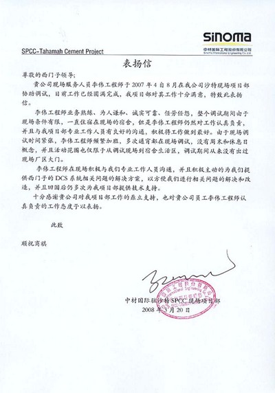工程師李偉於2007年4至8月(yue)期(qi)間(jian)在(zai)中(zhong)材(cai)國(guo)際(ji)工(gong)程(cheng)股(gu)份(fen)有(you)限(xian)公(gong)司(si)沙(sha)特(te)現(xian)場(chang)項(xiang)目(mu)部(bu)協(xie)助(zhu)調(tiao)試(shi),圓(yuan)滿(man)完(wan)成(cheng)任(ren)務(wu)。中(zhong)材(cai)國(guo)際(ji)工(gong)程(cheng)股(gu)份(fen)有(you)限(xian)公(gong)司(si)在(zai)對(dui)李(li)工(gong)的(de)表(biao)揚(yang)信(xin)裏(li)說(shuo),李(li)工(gong)業(ye)務(wu)熟(shu)練(lian), 積極地提供了西門子的DCS係統相關問題的解決方案;他為人謙和,經常和其他專業人員溝通技術問題;此外,李工對工作認真負責,為及時、順利地完成項目加班加點得工作,並在項目完成後依然提供後續的技術支持。