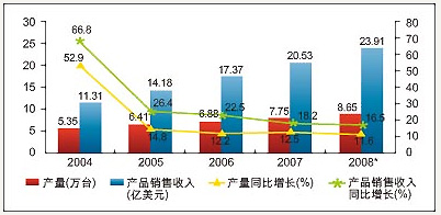 中國大陸製造業的快速增長及產品結構的升級,帶動了數控機床的大量需求。2007年,中國大陸市場數控機床的總銷量達7.52萬台,市場總銷售額達46.9億美元,同比增長15.6%;但本地產數控機床隻占市場總銷售額的37.8%。預計2008年將增長14.2%,達到53.54億美元 (見圖3)。
