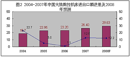 圖2:2004-2007年中國大陸數控機床進出口額逆差及2008年預測