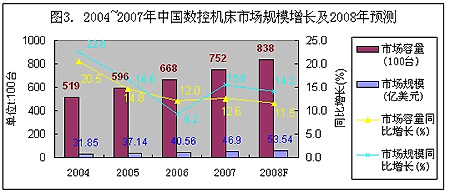 圖3:2004-2007年中國數控機床市場規模增長及2008年預測