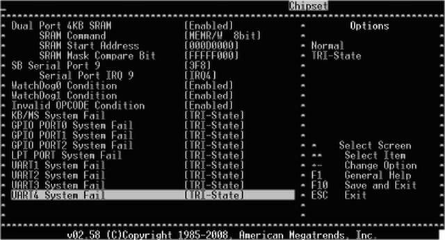 如上圖所示,Vortex86SX CPU提供了Dual Port 4KB SRAM空間給用戶作數據交換與備份使用,其內存開始地址為000D000;還有提供了COM9作數據傳輸端口;並在CMOS中有設計可選擇設置KB/MS、GPIO、LPT(並口)和串口TRI-State(抑製)狀態。