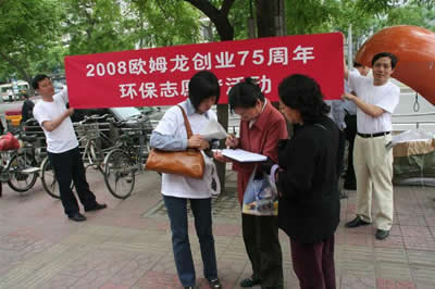 歐姆龍的環保推進計劃不僅僅停留在5月10日一天,集團總部製定了“Eco-Volun”(環保誌願者活動)等一係列。其中“Eco-Volun”活動是環境保護活動和誌願者活動的總稱。活動曆時半年,以75周年紀念為契機,把環保和誌願者活動普及到每一位員工的日常生活和工作當中,發揮集團35000人的集體能量。特別的是,各地區的員工將自己在日常生活,工作中的環保行動記錄下來,比如:出行選用公共交通或步行;午休/工作時間外關燈節電;不使用一次性筷子,循環使用紙張;義務植樹;積極參加2008北京奧運/2010上shang海hai世shi博bo誌zhi願yuan者zhe活huo動dong等deng等deng。記ji錄lu下xia來lai的de行xing為wei如ru達da到dao日ri本ben總zong部bu的de評ping估gu標biao準zhun,總zong部bu將jiang出chu資zi向xiang上shang海hai市shi九jiu段duan沙sha濕shi地di國guo家jia級ji自zi然ran保bao護hu基ji金jin會hui捐juan款kuan,最zui高gao捐juan款kuan額e可ke達da到dao1000萬日元,作為當地職員的獎勵,使每位職員都能夠體驗到“點滴環保小事,從我做起”的成功與快樂。