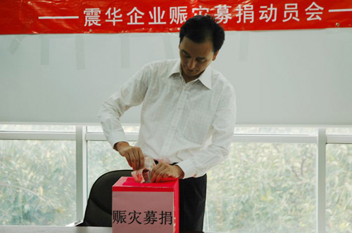 2008年5月16日,中華工控網(震華企業)舉辦了“天災無情人有情,震華企業獻愛心”為(wei)主(zhu)題(ti)的(de)抗(kang)災(zai)賑(zhen)災(zai)捐(juan)贈(zeng)活(huo)動(dong)。震(zhen)華(hua)企(qi)業(ye)古(gu)總(zong)經(jing)理(li)發(fa)表(biao)了(le)深(shen)情(qing)的(de)捐(juan)贈(zeng)倡(chang)議(yi),並(bing)帶(dai)頭(tou)捐(juan)贈(zeng)。隨(sui)後(hou),各(ge)員(yuan)工(gong)分(fen)別(bie)獻(xian)上(shang)了(le)自(zi)己(ji)對(dui)災(zai)區(qu)的(de)一(yi)份(fen)愛(ai)心(xin)。