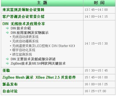 DIN(Drop- in Networking)。該技術巧妙地融合了ZigBee、Wi-Fi(無線以太網)、Cellular(GPRS/CDMA/EDGE10/3G)、TCP/IP、USB、串口等多種通信方式。可以快速靈活地建立無線私域網係統,令原來複雜困難的布線、集中管理、供電受限等問題變得輕而易舉。不論您是自動化領域的係統集成商、係統最終使用者還是OEM設備製造商或者科研院所,Digi DIN技術都將帶給您“無線的”價值。我們榮幸地邀請您出席本次高級研討會暨新品發布會。屆時,我們將和業界朋友們一起分享Digi最新先進的無線組網技術及ZigBee Mesh網狀網關鍵技術等。