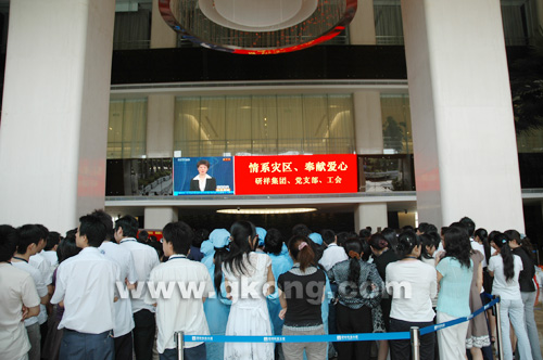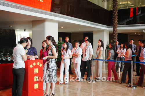 在現場,整個捐贈活動井然有序,各個部門都排著整齊的隊列走向捐款箱,深情地獻上自己對災區的一份愛心和祝福。