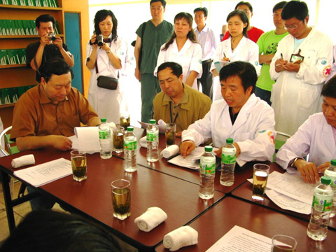 5月17日上午,國家電網公司總經理劉振亞(左一)來到國家電網公司設立在都江堰翠月湖培訓基地的抗戰救災醫療基地指導抗震救災醫療搶險工作。