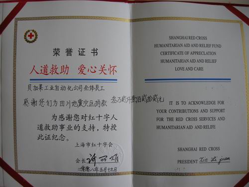在貝加萊(中國)行政部的組織號召下,貝加萊迅速做出反應。5月14日,貝加萊(中國)總部大樓內舉行了“守望相助,共度難關”——貝加萊抗震救災募捐活動。員工們紛紛慷慨解囊,踴躍捐款,短短幾天時間捐得善款36532元,貝加萊公司捐助15萬元,共計186532元,並於5月19日上午送到上海紅十字會。