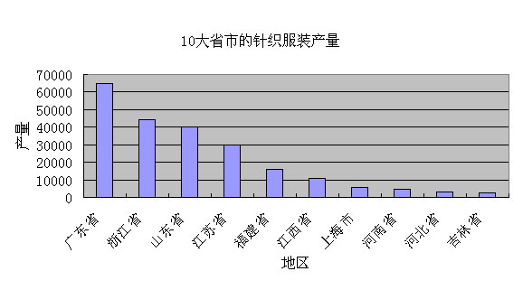 浙江省產量4.42億件、山東省產量3.99億件、江蘇省2.97億件、福建省1.59億件、江西省1.09億件、上海市0.55億件、河南省0.48億件、河北省0.29億件、吉林省0.27億件。以上10大省市的針織服裝產量約占全國總產量的絕大部分。