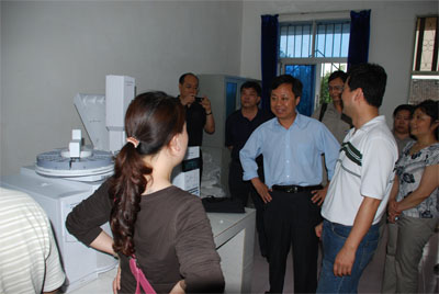 下圖:中國城鎮供水排水協會秘書長、建設部水質中心主任邵益生視察安捷倫支援監測站的設備並對安捷倫表示感謝。