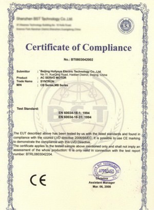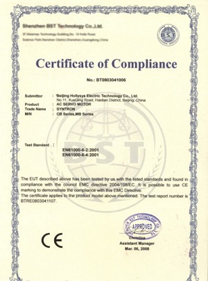繼2007年11月“syntron森創”伺服驅動器通過CE認證後,2008年2月,“syntron森創”CB、MB係列伺服電機順利通過EMC及LVD測試,成功獲得CE認證證書。