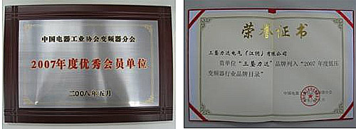 三墾力達電氣(江陰)有限公司公司憑借多年為中國節能減排工作做出的突出貢獻,榮獲“2007年度優秀會員單位”,“三墾力達”品牌被列入“2007年度低壓變頻器行業品牌目錄”。