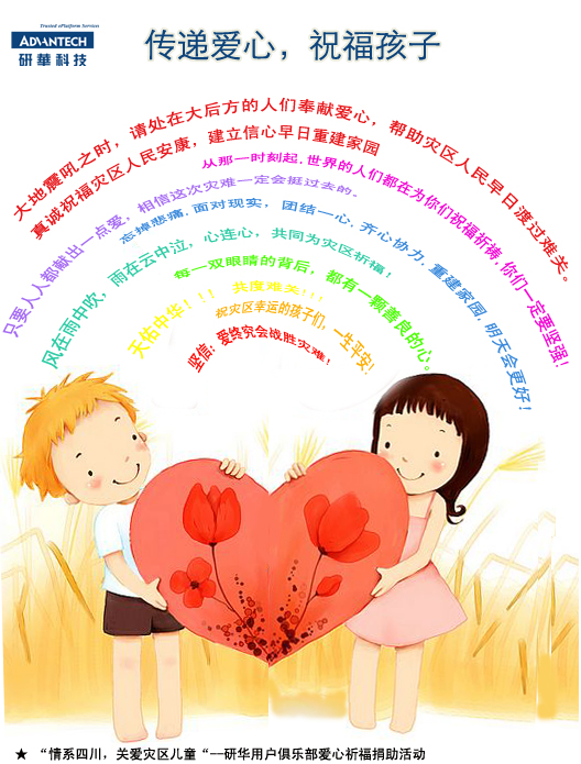 編者語: “傳遞愛心,祝福孩子”,不同的言語,不同的方式,傳達著同樣的愛。06 月03日,研華用戶俱樂部啟動“情係四川,關愛災區兒童”愛心祈福捐助活動,呼籲全體工控人為災區的孩子們祈福。