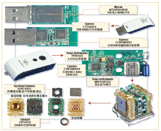 連接控製器和存儲器的是Cypress的CYWUSB6953 MCU,是它創建了與空中鼠標通信所需的一半2.4GHz無線鏈路。