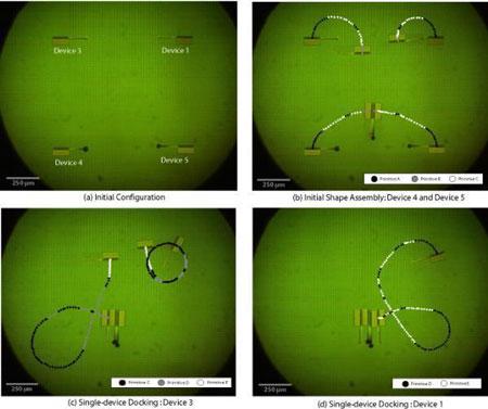 新的研究摘要描述了這個小組最新的成果:五(wu)個(ge)微(wei)型(xing)機(ji)器(qi)人(ren)在(zai)同(tong)一(yi)控(kong)製(zhi)係(xi)統(tong)下(xia)集(ji)體(ti)行(xing)動(dong)。唐(tang)納(na)德(de)研(yan)究(jiu)小(xiao)組(zu)在(zai)將(jiang)要(yao)發(fa)表(biao)一(yi)份(fen)報(bao)告(gao)中(zhong)寫(xie)道(dao),他(ta)們(men)的(de)工(gong)作(zuo)首(shou)次(ci)實(shi)現(xian)了(le)對(dui)一(yi)組(zu)多(duo)個(ge)微(wei)型(xing)機(ji)器(qi)人(ren)的(de)無(wu)繩(sheng)控(kong)製(zhi)。至(zhi)於(yu)科(ke)學(xue)家(jia)是(shi)如(ru)何(he)實(shi)現(xian)這(zhe)項(xiang)“微型集成”的,即將出版的最新一期《微電動係統》雜(za)誌(zhi)將(jiang)公(gong)布(bu)其(qi)詳(xiang)細(xi)的(de)細(xi)節(jie)。這(zhe)種(zhong)微(wei)型(xing)機(ji)器(qi)人(ren)之(zhi)所(suo)以(yi)可(ke)以(yi)那(na)麼(me)小(xiao),是(shi)因(yin)為(wei)它(ta)們(men)不(bu)用(yong)連(lian)接(jie)到(dao)外(wai)部(bu)控(kong)製(zhi)係(xi)統(tong)上(shang)。采(cai)用(yong)微(wei)芯(xin)片(pian)技(ji)術(shu)製(zhi)造(zao)的(de)這(zhe)種(zhong)機(ji)器(qi)人(ren),由(you)於(yu)工(gong)作(zuo)部(bu)分(fen)的(de)電(dian)壓(ya)不(bu)同(tong),它(ta)們(men)“每個人”對相同的“全球控製信號”fanyingbuyi。tangnadeshuo,quanqiukongzhijiuhaobixibaolidedanbaizhiduihuaxuexinhaodefanying。tangnadehaizengjingshiyongjisuanjisuanfayanjiushengwutideshenghuafanyingguocheng。zaixindeyanjiubaogaoli,tangnadedexiaozuxiangrenmenzhanshilezheyangyimu,youyuchicunherourenxinggeyoubutong,wugeweixingjiqirenkeyigenjuyuxianbianpaihaodefangshiqianjin、轉身、圍攏。