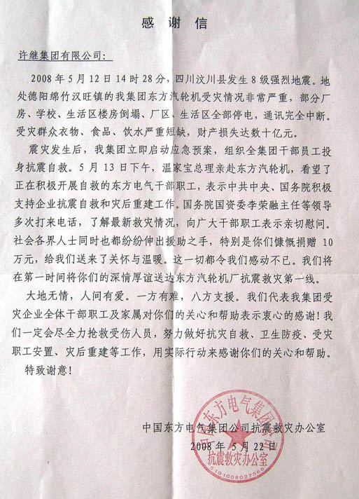 zaiqingfashenghou,xujijituangongsilingdaoxunsuxiangdongfangdianqijituanfachuweiwenhan,jishibiaodalexujiduizaiqurenmindeguanqiezhiqing,bingyutamenjianliqijinmilianxi。xujiguojigongchenggongsijijixiangyingjituangongsi“抗震救災送溫暖獻愛心”活動倡議,及時向東方電氣集團公司捐贈10萬元現金,支持其開展抗震自救和災後重建工作,以此表達許繼人與同行業兄弟企業同呼吸、共命運的深情厚意。