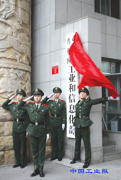 6月29日上午10時,在“東方紅”樂曲聲中,位於北京西長安街的原信息產業部正式更換牌匾為工業和信息化部,整個掛牌儀式莊重、簡樸,全部由武警戰士完成。