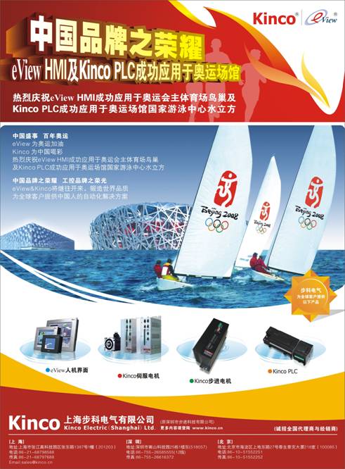 近日,步科電氣自主生產和研發的eView HMI及Kinco PLC成功應用於2008年第29屆北京奧林匹克運動會奧運場館工程,其中eView HMI成功應用於奧運會主體育場“鳥巢”工程; Kinco PLC成功應用於奧運場館國家遊泳中心“水立方”工程。步科電氣的產品能夠服務於2008年(nian)北(bei)京(jing)奧(ao)運(yun)場(chang)館(guan)項(xiang)目(mu),這(zhe)是(shi)一(yi)個(ge)企(qi)業(ye)用(yong)心(xin)經(jing)營(ying)多(duo)年(nian)的(de)結(jie)果(guo)。這(zhe)不(bu)僅(jin)是(shi)一(yi)個(ge)企(qi)業(ye)的(de)榮(rong)譽(yu),它(ta)是(shi)整(zheng)個(ge)中(zhong)國(guo)工(gong)控(kong)界(jie)的(de)榮(rong)譽(yu),是(shi)中(zhong)國(guo)品(pin)牌(pai)的(de)榮(rong)譽(yu),我(wo)們(men)終(zhong)於(yu)走(zou)出(chu)了(le)“中國製造”,正以先聲奪人的姿態向世界展示“中國品牌”的力量。