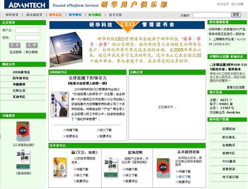 研華,7月 9日,2008 – 本月7日,研華用戶俱樂部全新推出讀書頻道,旨在延續研華CEO管理讀書會品牌活動。研華用戶俱樂部讀書頻道(以下簡稱“讀書頻道”)是由研華CEO管理讀書會延伸而來,由最初內部員工活動擴展到研華與客戶、合作夥伴等外界交流,致力於為廣大用戶快捷、翔實、提供研華CEO管理讀書會的相關信息,突破傳統“讀書”概念,以網絡形式與更多人分享讀書心得與管理經驗,增進研華與用戶、用戶與用戶之間的互動交流,傳達研華“讀書·學習·分享”的理念。