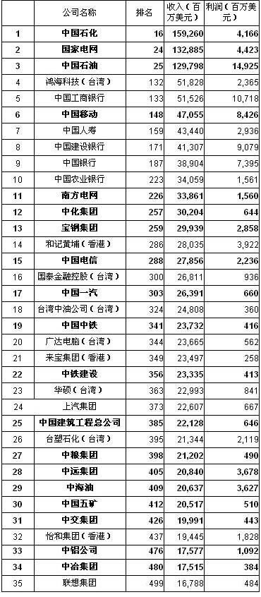 日前,《財富》雜誌(fortune.com)公布了2008年度世界 500強 企業(globle 500)排行榜。中國入圍企業達到35戶(其中內地企業26戶、香港3戶、台灣6戶)。上榜的中央企業達到19戶。中國石化以第16名的座次成為世界500強中排名最高的中國企業,在亞洲僅次於日本豐田公司。