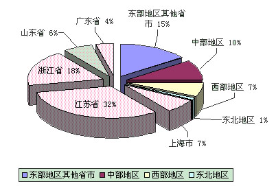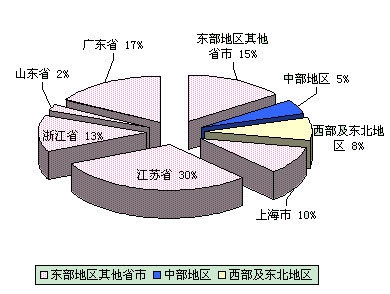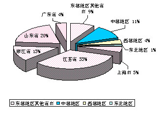 紡織機械產品出口 交貨總值占全部工業銷售產值(現行價)比重全國為11.78%。從各省情況看,出口 交貨值占工業銷售產值比重最高的是廣東省為41.36%,依次是北京市(29.17%)、上海市(27.56%)、山西省(26.08%)、天津市(20.02%)。出口 交貨值排在前五位的是:江蘇省、廣東省、浙江省、上海市、北京市,五省市出口 交貨值相加占全部出口 交貨值總額的80.33%。