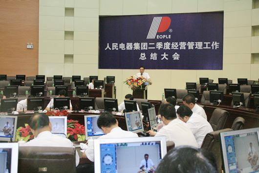 文明古城,魅力邯鄲!位於邯鄲的鑫港國際商貿中心圓桌會議廳座無虛席,充滿喜慶氣氛,5月19日至20日,人民電器集團2008年第二季度經營管理總結大會在這裏隆重召開。集團領導鄭元豹、總經理葉玉森、監事長包巨文出席了大會並作了重要講話,集團下屬公司負責人葉林、陳勝利、陳林鋒、葉向宇、包啟樹、朱星茶、胡啟明、王革等出席會議並在大會上發言。大會堅持以鄭元豹董事長“深化改革,創新圖強”為方針,回顧了今年二季度的工作進展、取得的成就與存在的不足,並部署了第三季度的工作。