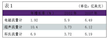 據Flowresearch的網絡調查,近5年國際經濟普遍不太景氣的形勢下,流量儀表世界市場年均增長率(CAGR)仍達到了2.6%,銷售額從2002年的31億美元增長到2007年的35億美元,其中傳統儀表(節流、容積、渦輪、轉子流量計等)為負增長,CAGR為-2.2%,從2002年的16.43億美元(占總量53%)降至2007年的15.05億美元(占43%);而新型儀表(電磁、超聲、科氏流量計等)年增長率平均達6.2%,自2002年的14.57億美元增至2007年的20.19億美元,其中,電磁、超聲、科氏流量計的年增長率及銷售額見表1。電磁流量計的CAGR不到2%,因其基數已較大,而且技術也較成熟。