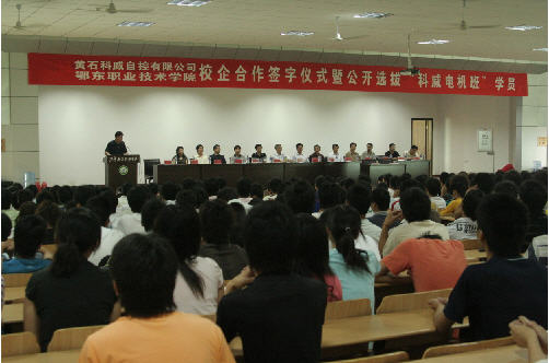 鄂東職業技術學院、黃石科威自控有限公司校企合作儀式暨“科威電梯班”公開選拔學員,於5月22日在鄂東職院舉行,標誌著“科威電梯班”即將在鄂東職院開班。鄂東職院黨委書記、院長饒水林、科威公司總經理龔雲生出席了簽字儀式。