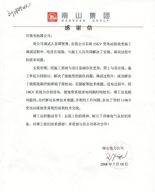 近期,許繼電抗器公司接連收到了南山電力公司、中電大豐風力發電公司發來的感謝信,對公司技術部員工譚智勇在產品售後服務工作中,表現出的不怕吃苦、勤奮肯幹、忘(wang)我(wo)工(gong)作(zuo)的(de)精(jing)神(shen),耐(nai)心(xin)周(zhou)到(dao)的(de)服(fu)務(wu)態(tai)度(du),紮(zha)實(shi)精(jing)湛(zhan)的(de)技(ji)術(shu)素(su)質(zhi)給(gei)予(yu)了(le)高(gao)度(du)讚(zan)揚(yang)。南(nan)山(shan)電(dian)力(li)公(gong)司(si)還(hai)表(biao)示(shi)近(jin)期(qi)要(yao)再(zai)續(xu)訂(ding)許(xu)繼(ji)的(de)消(xiao)弧(hu)成(cheng)套(tao)產(chan)品(pin),並(bing)點(dian)名(ming)要(yao)譚(tan)智(zhi)勇(yong)再(zai)去(qu)服(fu)務(wu)。這(zhe)是(shi)用(yong)戶(hu)對(dui)我(wo)們(men)工(gong)作(zuo)的(de)極(ji)大(da)信(xin)任(ren)和(he)最(zui)高(gao)褒(bao)獎(jiang)。譚(tan)智(zhi)勇(yong)同(tong)誌(zhi)在(zai)工(gong)作(zuo)中(zhong)的(de)主(zhu)要(yao)表(biao)現(xian):