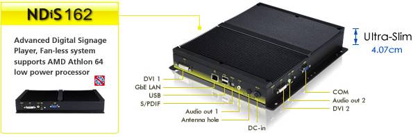 NDiS 162是特別為客戶端顯示內容而設計,超薄尺寸可以很容易掛在大型設備如LCD TV 或PDP的後麵板上。伴隨革命性的無風扇設計, NDiS 162是各種數字電子看板應用之高可靠和完美的選擇。