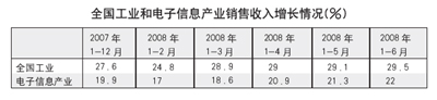 2.全(quan)行(xing)業(ye)增(zeng)速(su)小(xiao)幅(fu)回(hui)升(sheng)。自(zi)去(qu)年(nian)我(wo)國(guo)電(dian)子(zi)信(xin)息(xi)產(chan)業(ye)出(chu)現(xian)階(jie)段(duan)性(xing)新(xin)特(te)征(zheng),各(ge)項(xiang)指(zhi)標(biao)增(zeng)速(su)都(dou)低(di)於(yu)全(quan)國(guo)工(gong)業(ye)平(ping)均(jun)水(shui)平(ping)以(yi)來(lai),今(jin)年(nian)全(quan)行(xing)業(ye)增(zeng)速(su)出(chu)現(xian)小(xiao)幅(fu)回(hui)升(sheng)。1-6月全行業增長22%,高於去年同期3.2個百分點,與全國工業增幅的差距有所減少。