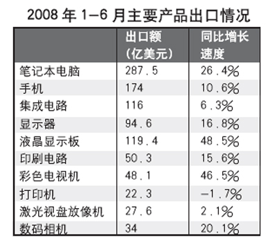 5.產品出口平穩增長。1-6月,電子信息產品對外貿易額達到4239.8億美元,占全國外貿總額的20.9%。出口2448.1億美元,同比增長23.6%,比全國出口增速高1.8個百分點,占全國出口總額的比重為 36.7%;進口1791.7億美元,同比增長17.4%,占全國進口總額的比重為31.6%。分產品來看,筆記本電腦、彩電、數碼相機等大宗產品出口增速均超過20%,但手機、激光視盤放像機、集成電路出口增速較緩,打印機出口負增長。