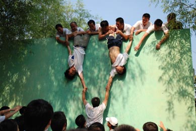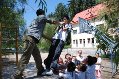畢業牆:上午的活動讓我們對團隊的概念有了新的理解,麵對這個高達4米(mi)多(duo)的(de)陡(dou)牆(qiang)時(shi),我(wo)心(xin)裏(li)信(xin)心(xin)百(bai)倍(bei),相(xiang)信(xin)我(wo)們(men)團(tuan)隊(dui)一(yi)定(ding)能(neng)夠(gou)順(shun)利(li)完(wan)成(cheng)這(zhe)個(ge)挑(tiao)戰(zhan)。很(hen)多(duo)隊(dui)友(you)站(zhan)了(le)出(chu)來(lai),他(ta)們(men)甘(gan)願(yuan)做(zuo)最(zui)下(xia)麵(mian)的(de)人(ren)梯(ti),幾(ji)天(tian)之(zhi)後(hou),他(ta)們(men)肩(jian)上(shang)的(de)腳(jiao)印(yin)還(hai)在(zai)。有(you)的(de)隊(dui)友(you),自(zi)己(ji)上(shang)去(qu)了(le),還(hai)倒(dao)掛(gua)下(xia)來(lai),接(jie)住(zhu)下(xia)麵(mian)的(de)隊(dui)友(you),水(shui)泥(ni)牆(qiang)在(zai)他(ta)們(men)腿(tui)上(shang)、胳膊上蹭的都是青塊,這不是讓我們說一聲感動就能表達出感受的。