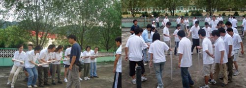 所謂“挑戰150秒”,就是每個隊要在150秒中完成:傳接球,集體跳繩7次ci,不bu倒dao森sen林lin,過guo圈quan,拍pai手shou四si項xiang活huo動dong,主zhu要yao訓xun練lian團tuan隊dui合he作zuo能neng力li。教jiao練lian講jiang完wan每mei項xiang活huo動dong的de規gui則ze後hou,給gei出chu一yi個ge小xiao時shi的de訓xun練lian時shi間jian。每mei支zhi隊dui伍wu都dou在zai隊dui長chang的de帶dai領ling下xia緊jin張zhang訓xun練lian起qi來lai,在zai訓xun練lian過guo程cheng中zhong,大da家jia都dou感gan受shou到dao時shi間jian的de緊jin迫po,一yi開kai始shi有you些xie慌huang亂luan,好hao像xiang有you勁jin使shi不bu上shang,這zhe種zhong團tuan體ti項xiang目mu要yao求qiu每mei名ming隊dui員yuan團tuan結jie一yi致zhi,互hu相xiang幫bang助zhu,更geng重zhong要yao的de是shi要yao有you一yi個ge隊dui長chang組zu織zhi協xie調tiao、集ji思si廣guang益yi,迅xun速su總zong結jie出chu動dong作zuo要yao領ling,然ran後hou要yao求qiu每mei名ming隊dui員yuan領ling會hui,並bing堅jian決jue執zhi行xing。最zui後hou每mei個ge隊dui都dou順shun利li完wan成cheng了le各ge項xiang活huo動dong,朝chao陽yang隊dui在zai激ji烈lie的de競jing爭zheng中zhong脫tuo穎ying而er出chu,成cheng為wei第di一yi名ming。