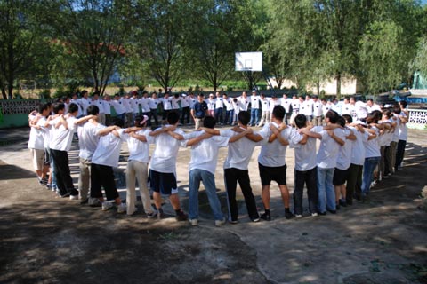 稍候,馬上就進入了拓展的第一個項目:起隊名、做隊旗、想口號、編(bian)隊(dui)歌(ge)。大(da)家(jia)頓(dun)時(shi)興(xing)奮(fen)起(qi)來(lai),進(jin)入(ru)了(le)的(de)激(ji)烈(lie)的(de)討(tao)論(lun)中(zhong)。大(da)家(jia)都(dou)積(ji)極(ji)地(di)發(fa)揮(hui)自(zi)己(ji)的(de)聰(cong)明(ming)才(cai)智(zhi),出(chu)謀(mou)劃(hua)策(ce)。經(jing)過(guo)初(chu)步(bu)的(de)討(tao)論(lun)分(fen)組(zu),所(suo)有(you)人(ren)分(fen)成(cheng)四(si)隊(dui),分(fen)別(bie)是(shi):雷霆隊、朝陽隊、OK隊和火箭隊,由四個老師分別帶領訓練。