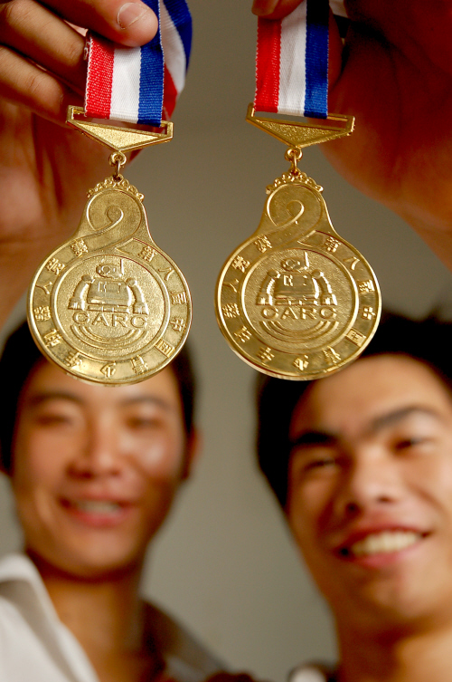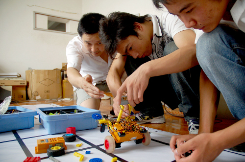 新華網浙江頻道8月14日電 昨天下午,嘉善中專學生顏立強、周國亮在鬱洪老師的指導下組裝智能機器人。據了解,上個月他們所組裝的機器人,在湖南長沙由中國科學技術協會組織的“第八屆中國青少年機器人競賽”中,出色地完成了以《看北京奧運》為主題任務的“即興機器人擂台比賽”,以總分第一的成績獲得金牌,這也是我縣參加此項比賽以來的最好成績。(見習記者 胡淩翔 攝)