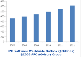 根據最新的ARC谘詢集團公司研究報告顯示,在2007年世界上人機交互(HMI)軟件與服務市場總額超過了9.26億美元,並將有望在2012年超過14.3億美元,它將超過工業自動化市場總額,且在未來5年時間內將以綜合年增長率超過9.1%的速度增長。