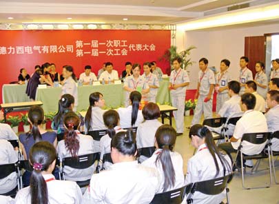 128名職工代表參加了在德力西工業園召開的第一屆一次職工代表大會暨第一屆一次工會代表大會。上午9時,正式會議在莊嚴的國歌聲中開幕。