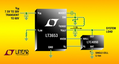 淩力爾特公司 (Linear Technology Corporation) 推出具可編程輸出電流限製的 1.2A、1.5MHz 單片電流模式降壓型開關穩壓器 LT3653。一般情況下,它用於電池充電器電源通路控製器,以預調輸出並優化電池充電器效率。其 7.5V 至 30V 的寬輸入工作電壓範圍使 LT3653 非常適合於多種輸入源,包括未穩壓的 12V 交流適配器、24V 工業電源和 Firewire 以及汽車應用。片上輸入過壓閉鎖保護該器件可經受高達 60V 的輸入瞬態,如汽車應用中常發現的那些輸入瞬態。