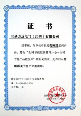 三墾變頻器經過嚴格審核,符合“全國節能監測管理中心—全國節能產品數據庫”的相關要求,被列入變頻器類節能產品數據庫(證書編號:JN088-2008)。