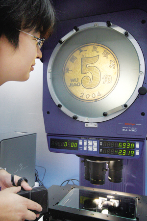 技術人員說,這台投影儀“不僅能夠放大看清十分微小的零件,甚至可以直接測量出距離”,就是說“這個1角錢硬幣上有多少個肉眼難見的小坑,坑有多深、多大,全能測量出來”。