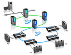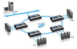 ----------------------------------------------------------------------------------------------------- Moxa 專利開發的 Turbo Ring 通訊協議具備網絡上最佳的通訊備份功能,並能在最快時間內恢複通訊。Turbo Ring 與 Turbo Ring V2 通訊協議可將一台 NPort 6000 作為網絡上的主機,然後自動阻止封包穿越網絡中的任何備份路徑。 ruguohuanwangzhongderenyifenzhiyuwangluodeqitaquduanfashengduanxiandeqingkuang,tongxunxieyihuizidongzhongxintiaozhenghuanwang,rangzhongduandewangluoquduankeyizhongxinyuwangluodeshengyuquduanhuifulianji。