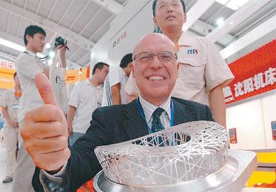 沈陽機床集團有一台會雕“鳥巢”的數控機床,在本屆製博會上成了萬眾矚目的明星,9月4日,它高票奪得了製博會金獎。令人振奮的是,“沈陽製造”再度稱雄製博會,20件獲獎展品中沈陽占了13件,此外還有沈陽的14家參展企業或單位獲得最佳組織獎、最佳展示獎或紀念獎。