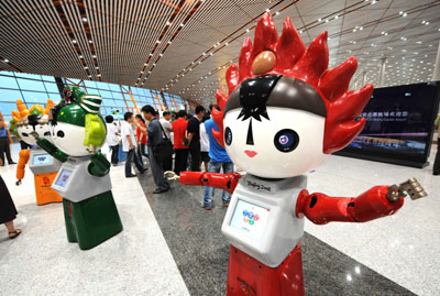 在3號hao航hang站zhan樓lou出chu港gang大da廳ting,五wu個ge福fu娃wa機ji器qi人ren為wei來lai往wang旅lv客ke進jin行xing列lie隊dui表biao演yan,機ji器qi人ren的de精jing彩cai表biao演yan,引yin來lai過guo往wang旅lv客ke一yi片pian驚jing呼hu之zhi聲sheng,一yi些xie旅lv客ke和he福fu娃wa機ji器qi人ren留liu影ying,並bing與yu之zhi進jin行xing語yu言yan交jiao流liu。