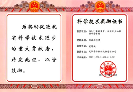 2008年9月8日下午,湖北省人民政府在武昌東湖賓館隆重舉行了湖北省科學技術獎勵大會,大會表彰了2007年度省科技成果的獲得者。省委書記羅清泉出席會議,省領導宋育英、張昌爾、李明波、湯濤、吳永文出席會議並為獲獎代表頒獎。省委常委、常務副省長李憲生主持大會,副省長郭生練宣讀《省人民政府關於2007年度科學技術獎勵的決定》。華中數控公司“HNC-21數控裝置、伺服及主軸驅動成套係統”科技成果榮獲2007年度湖北省科技進步二等獎。