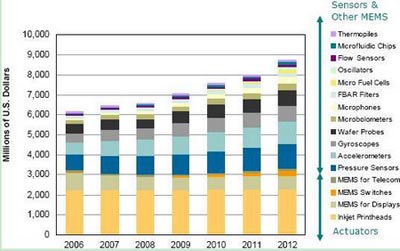 加速計、陀螺儀、麥克風、壓力傳感器、體聲波(BAW)濾波器、流量傳感器、微流體芯片、微輻射計、熱電堆和振蕩器的全球市場正在以每年11%的速度增長,並在2007年首次超過了激勵器市場。