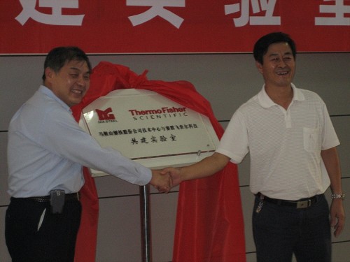 (2008年10月13日,上海)近(jin)日(ri),馬(ma)鋼(gang)技(ji)術(shu)中(zhong)心(xin)與(yu)賽(sai)默(mo)飛(fei)世(shi)爾(er)科(ke)技(ji)共(gong)建(jian)實(shi)驗(yan)室(shi)的(de)簽(qian)字(zi)揭(jie)牌(pai)儀(yi)式(shi)在(zai)馬(ma)鋼(gang)技(ji)術(shu)中(zhong)心(xin)隆(long)重(zhong)舉(ju)行(xing)。該(gai)共(gong)建(jian)實(shi)驗(yan)室(shi)的(de)成(cheng)立(li)標(biao)誌(zhi)著(zhe)兩(liang)家(jia)公(gong)司(si)為(wei)加(jia)強(qiang)企(qi)業(ye)間(jian)合(he)作(zuo)實(shi)現(xian)雙(shuang)贏(ying)邁(mai)出(chu)了(le)重(zhong)要(yao)的(de)一(yi)步(bu),馬鋼技術中心處長張明如先生與賽默飛世爾科技科學儀器事業部中國商務運營總監孫建一先生代表雙方在合作協議上簽字並共同為共建實驗室揭牌。