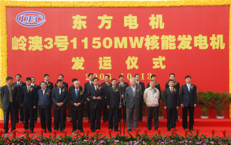 2008年10月13日上午,在東方電機創立50周年的喜慶日子裏,由東方電機生產製造的廣東嶺澳三號1150兆瓦核能發電機,在完成型式試驗後從四川德陽啟運。這是東方電氣以主承包商的方式承製的首台國產化核能發電機。