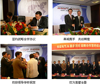 2008年10月25日16:30分fen,在zai五wu彩cai繽bin紛fen的de禮li花hua和he芬fen芳fang四si溢yi的de香xiang檳bin酒jiu中zhong,泰tai永yong科ke技ji股gu份fen有you限xian公gong司si黃huang正zheng乾qian董dong事shi長chang與yu長chang征zheng電dian氣qi股gu份fen有you限xian公gong司si李li勇yong總zong經jing理li交jiao換huan了le簽qian約yue文wen件jian,兩liang位wei企qi業ye領ling軍jun人ren物wu的de手shou緊jin緊jin握wo在zai一yi起qi,拉開了泰永科技與長征電氣戰略合作的序幕!