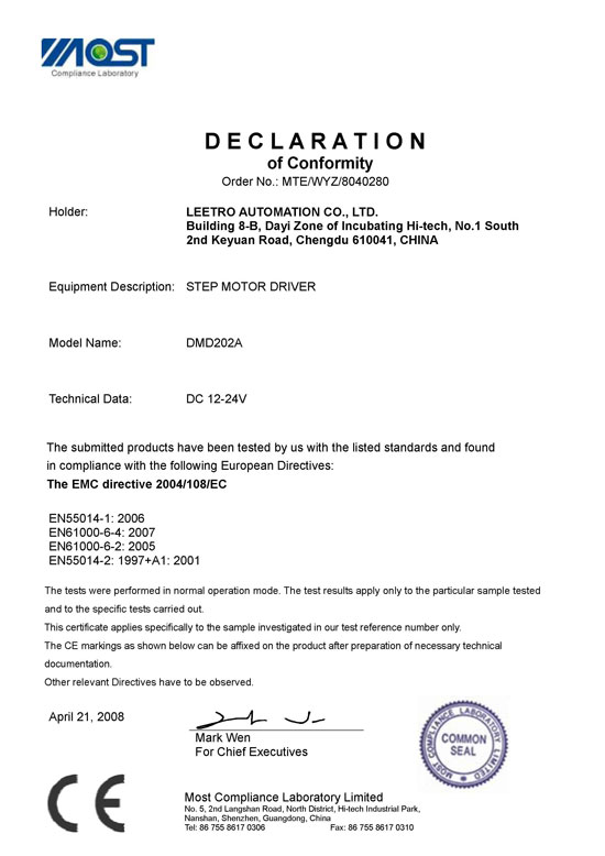 樂創自行研發生產的的步進電機驅動器DMD202A順利通過CE安全認證