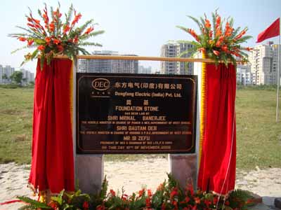 2008年11月10日,東方電氣(印度)有you限xian公gong司si成cheng立li暨ji服fu務wu中zhong心xin奠dian基ji慶qing典dian儀yi式shi在zai印yin度du加jia爾er各ge答da新xin城cheng東dong方fang所suo購gou土tu地di現xian場chang隆long重zhong舉ju行xing。這zhe是shi中zhong國guo發fa電dian設she備bei製zhi造zao企qi業ye在zai印yin度du建jian立li的de第di一yi個ge公gong司si,當dang中zhong華hua人ren民min共gong和he國guo國guo歌ge響xiang徹che在zai加jia爾er各ge答da上shang空kong時shi,在zai場chang的de東dong方fang人ren感gan到dao尤you為wei自zi豪hao。